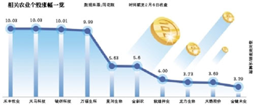 受此影響,2月6日,相關(guān)農(nóng)業(yè)股、期貨等均出現(xiàn)大漲,其中,農(nóng)產(chǎn)品加工、農(nóng)機等農(nóng)業(yè)股迎來新年首個紅包,漲幅居前,多只股票漲停。
