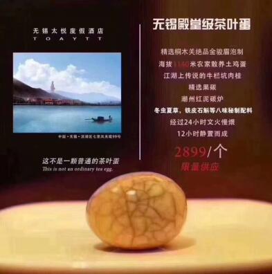 “精選桐木關絕品金駿眉泡制,海拔1140米農(nóng)家散養(yǎng)土雞蛋,江湖上傳說的牛欄坑肉桂,精選果碳、潮州紅泥炭爐,冬蟲夏草、鐵皮石斛等八味秘制配料,經(jīng)過24小時文火慢煨,12小時靜置而成的——無錫殿堂級茶葉蛋,2899元每顆且限量供應。近日,無錫太悅度假酒店公開銷售的茶葉蛋成為了網(wǎng)紅。