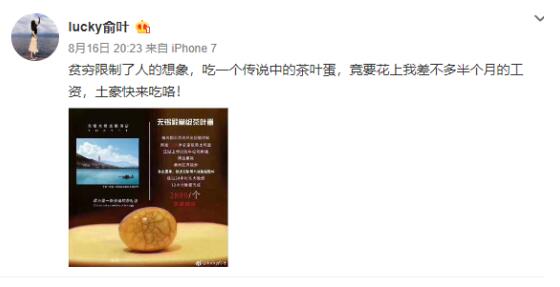 對于該茶葉的走紅,網(wǎng)友議論紛紛。有人認為這是嘩眾取寵,和某針管書法家有異曲同工之妙,有人詢問”吃了會上天?“,還有人一口認定”這不是洗錢嗎“,也有網(wǎng)友就所謂”精選果碳、潮州紅泥炭爐“提出質疑:”再牛逼的木材燒出來的火溫難道還有差別?“,更多網(wǎng)友自嘲,貧窮限制了人的想象,吃一個傳說中茶葉蛋,竟要花上我差不多半個月的工資。